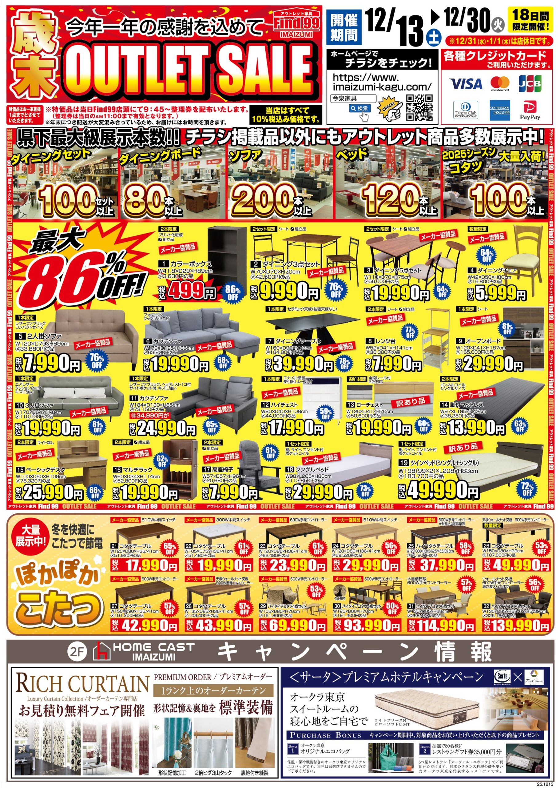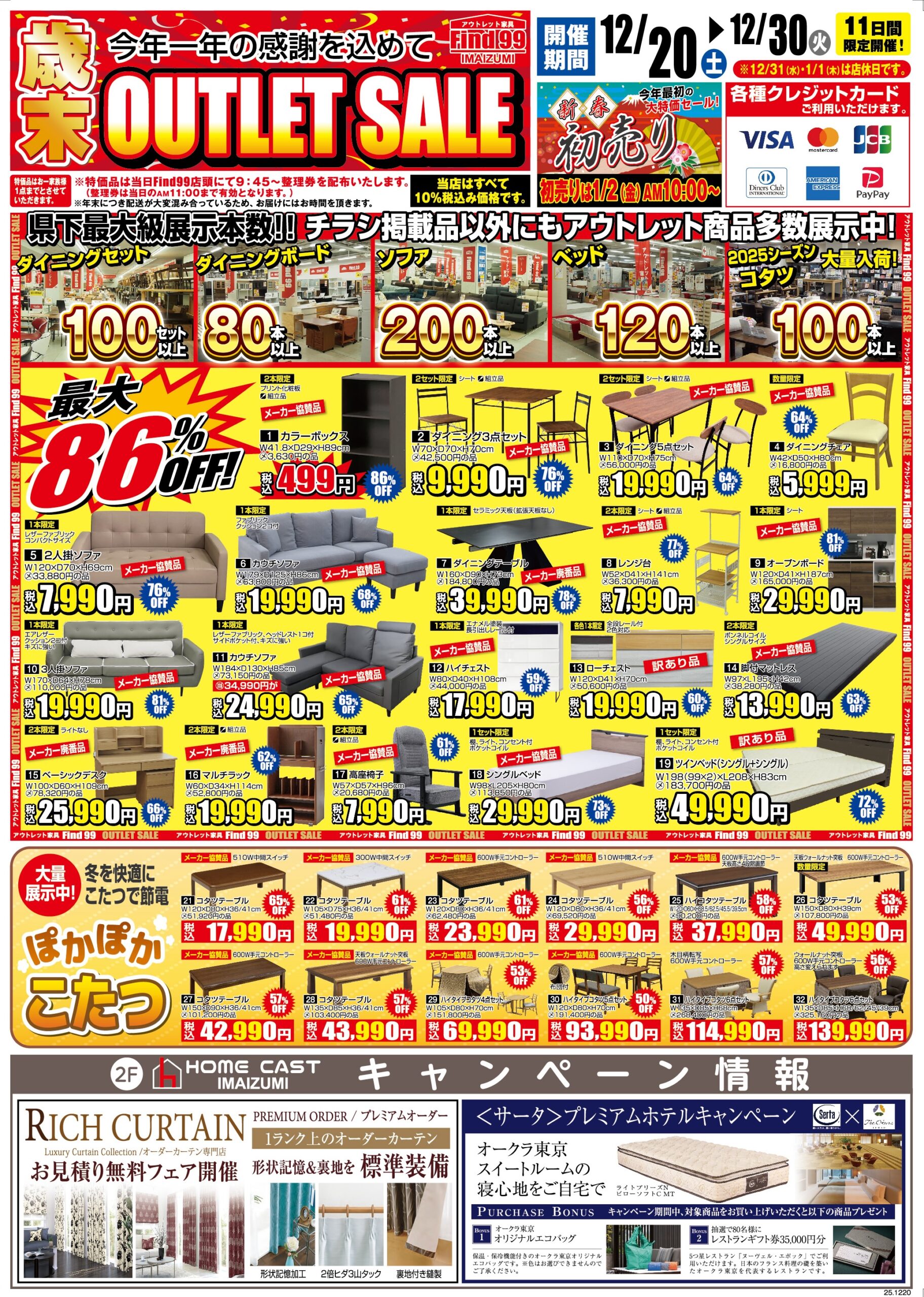 | 開催日 | ・HOMECAST 【歳末カリモク家具プレミアムフェア】 ・HOMECAST 【シモンズ・サータ プレミアムセール】 🗓️12月6日(土)〜12月28日(日) ・FIND 99 【歳末 OUTLET SALE】 🗓️12月13日(土)〜12月30日(火) |