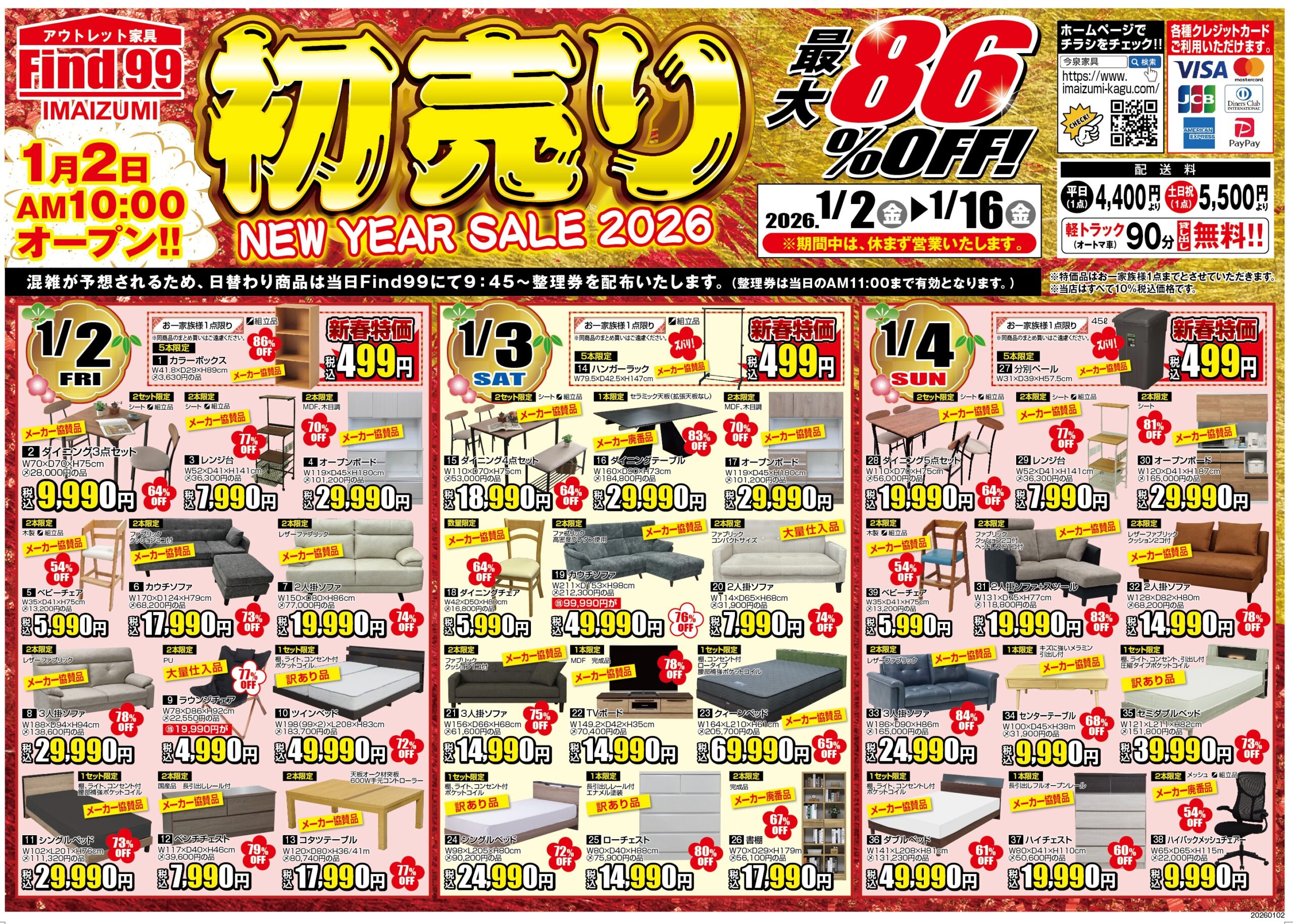 | 開催日 | ・HOMECAST 【レザーテックスフェア】 ・HOMECAST 【カーテン・ロールスクリーンフェア】 🗓️1月2日(金)〜2月1日(日) ・FIND 99 【初売り】 🗓️1月2日(金)〜1月16日(金) |