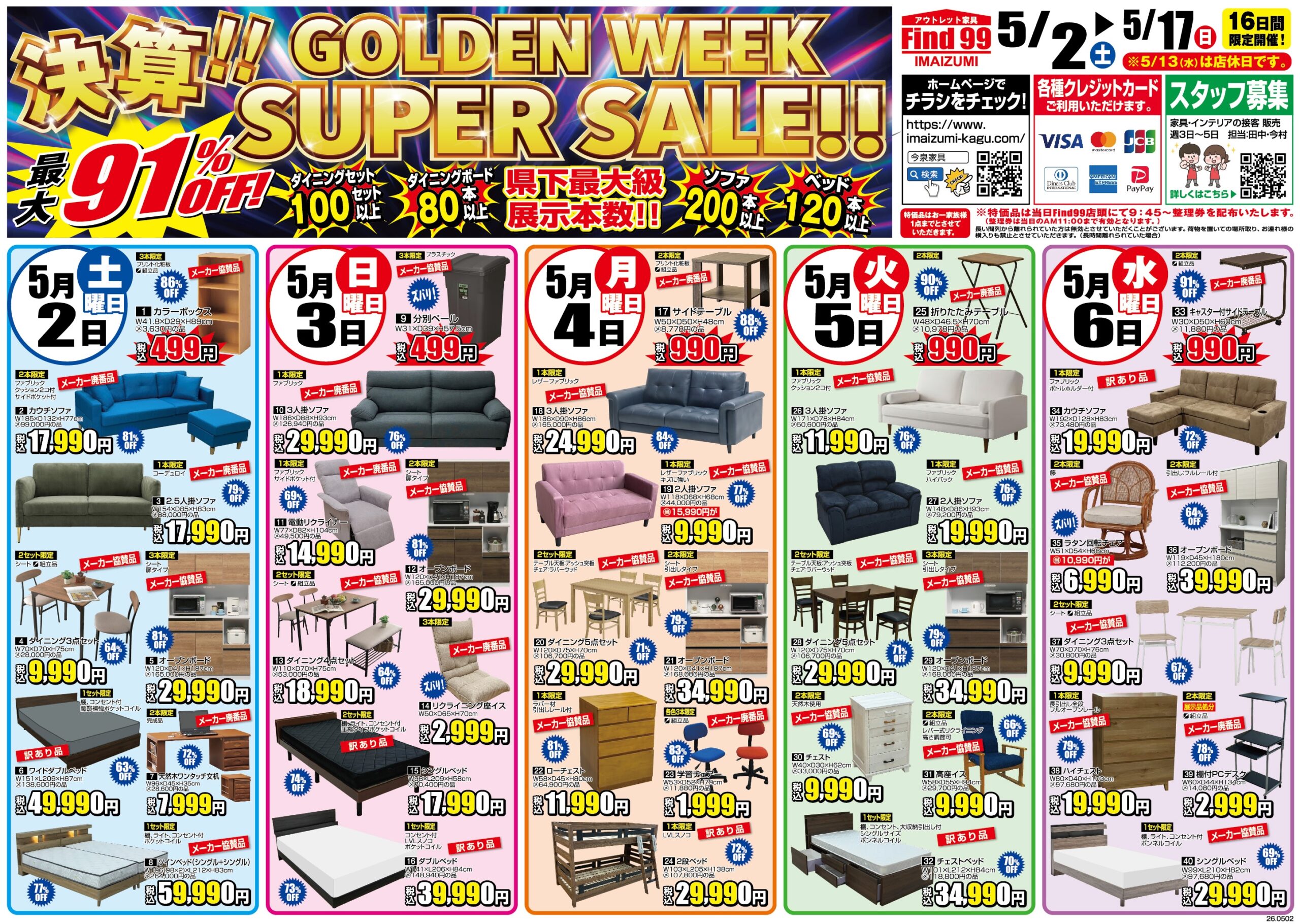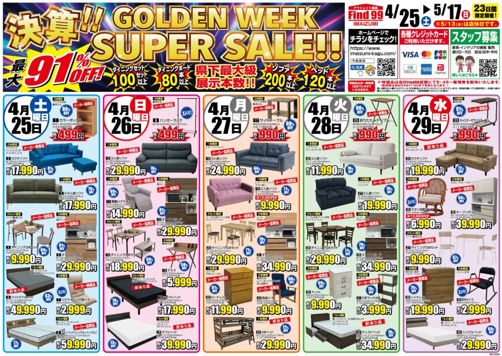 【今泉家具1F Find99】決算!!GOLDENWEEK SUPER SALE
