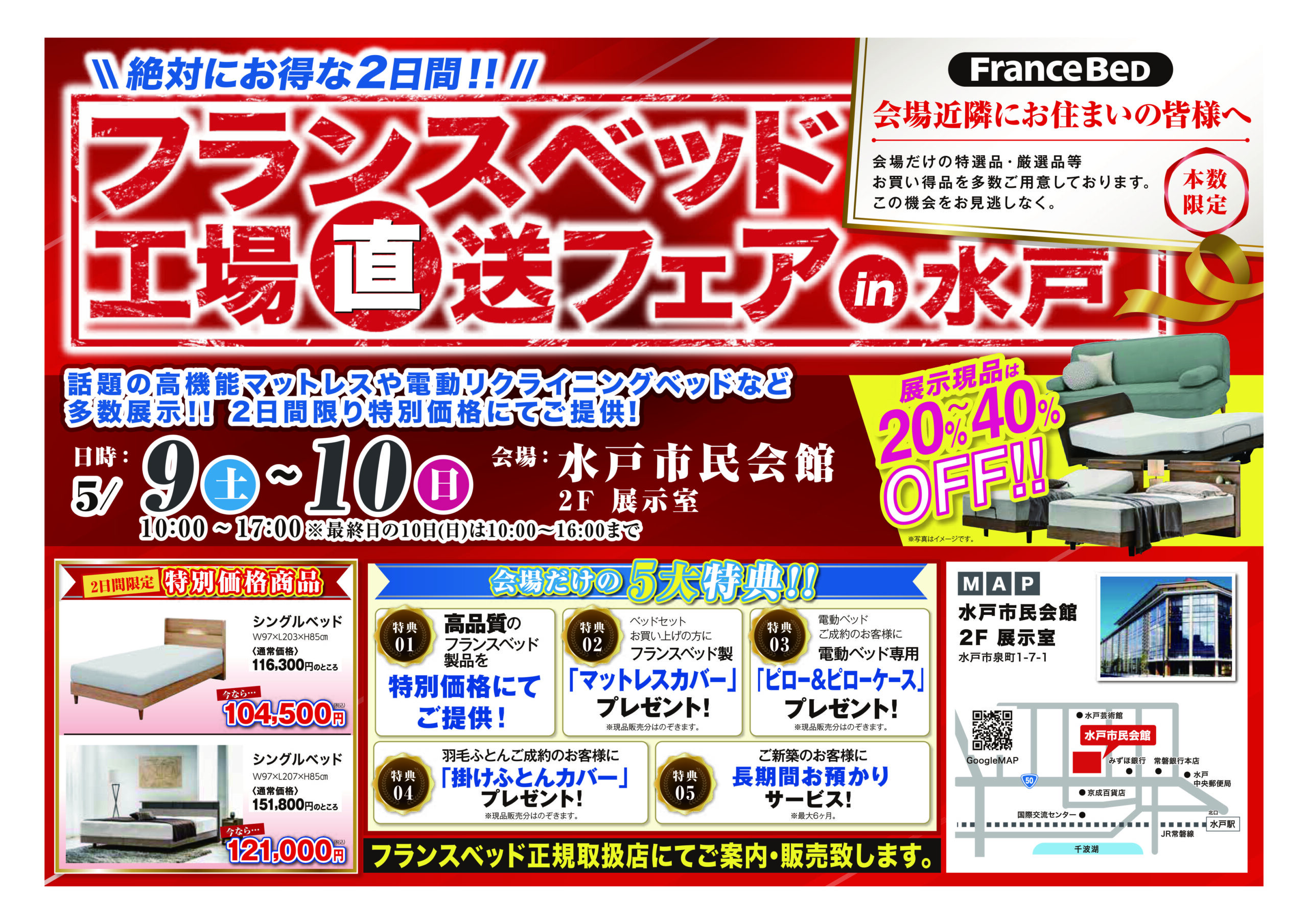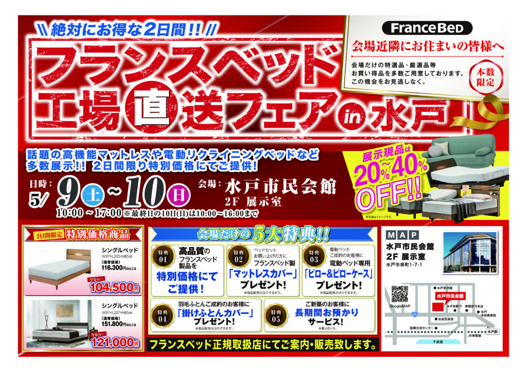 | 開催場所 | 【今泉家具】 〒312-0033 茨城県ひたちなか市市毛840 今泉家具2F HOMECAST 1F Find99 フランスベッド工場直送フェア in 水戸 【水戸市民会館】 〒310-0026 茨城県水戸市泉町1丁目7−1 水戸市民会館 2F 展示室 |