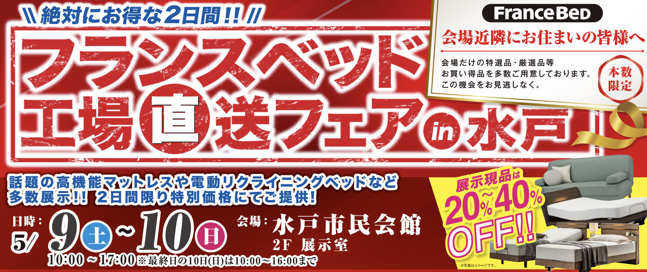| 開催時間 | 【HOMECAST & Find99】 10時00分~19時00分 【フランスベッド工場直送フェア in 水戸】 10時00分~17時00分 ※10日は16時まで |